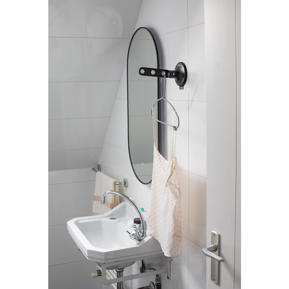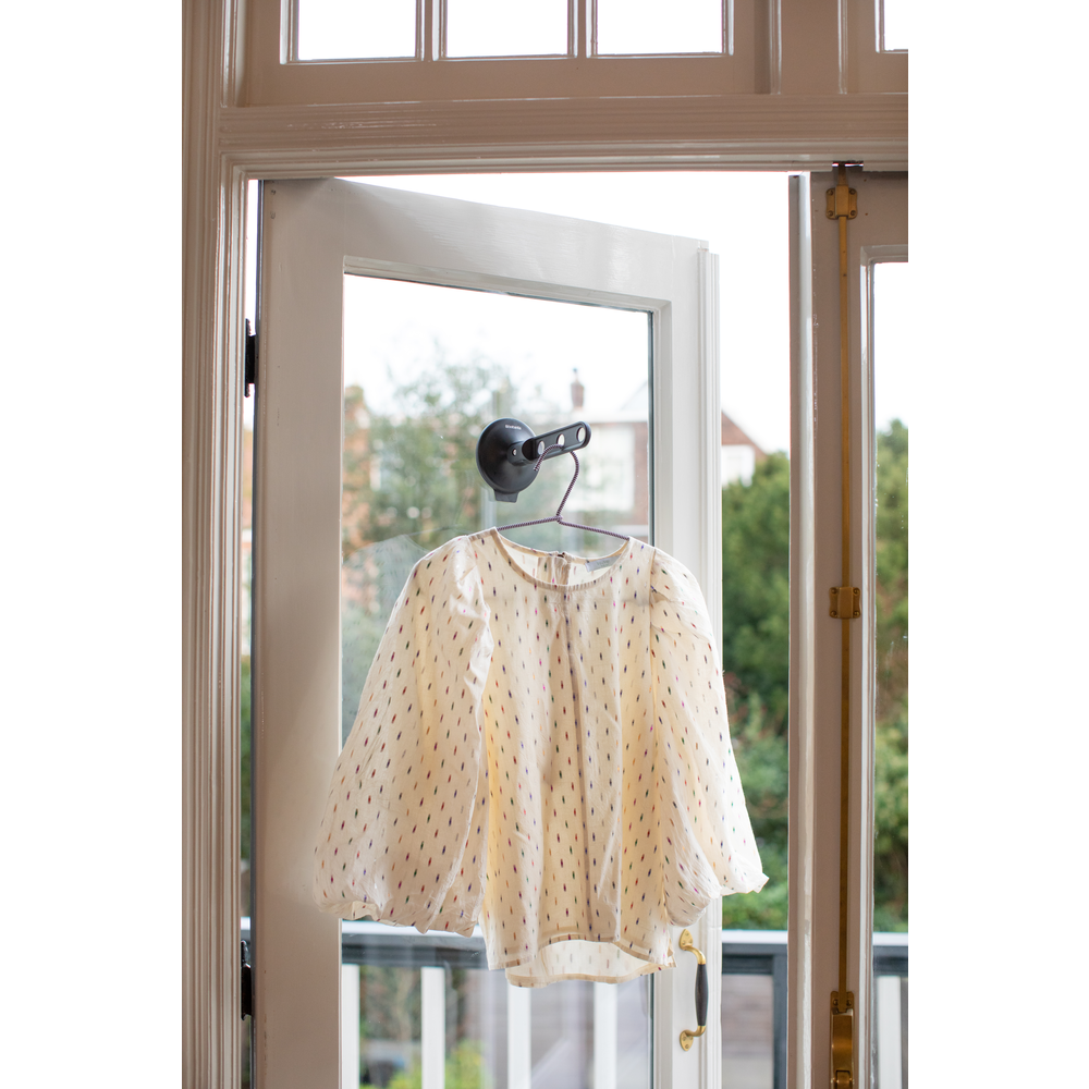 Brabantia klädkrok med sugkopp kan du hänga upp dina kläder var du vill. Denna smarta klädkrok kan bära 3 galgar och upp till 2 kg vikt. Fäst bara kroken på ett öppet fönster, på en (dusch) dörr eller kakel och låt dina kläder ventileras väl. Också perfekt för torkning av blusar, som du hänger på galgar efter tvätt!